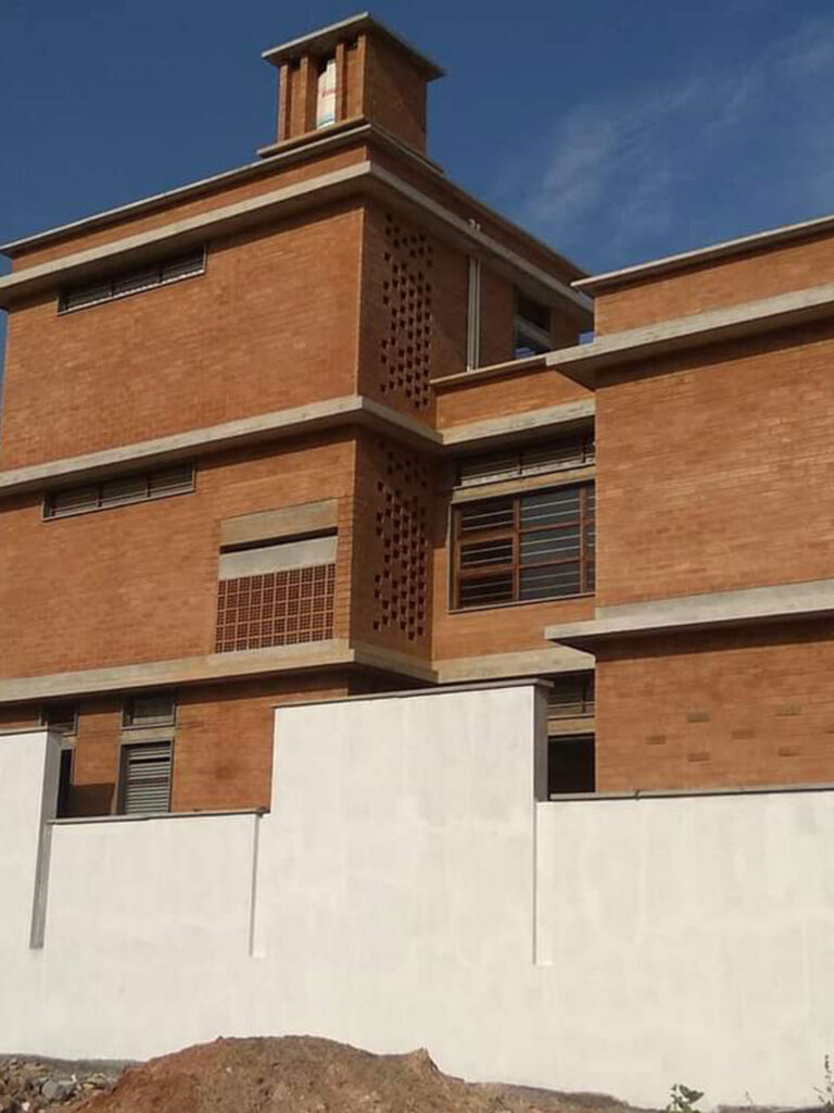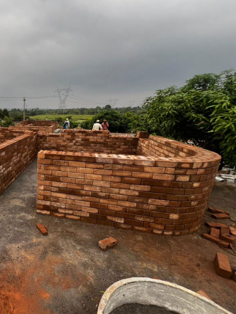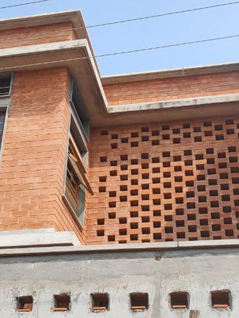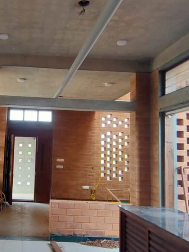 The project features exposed block facades, jali ventilation walls, a uniform compound wall, and a warm interior feature wall all crafted with precision and durability.